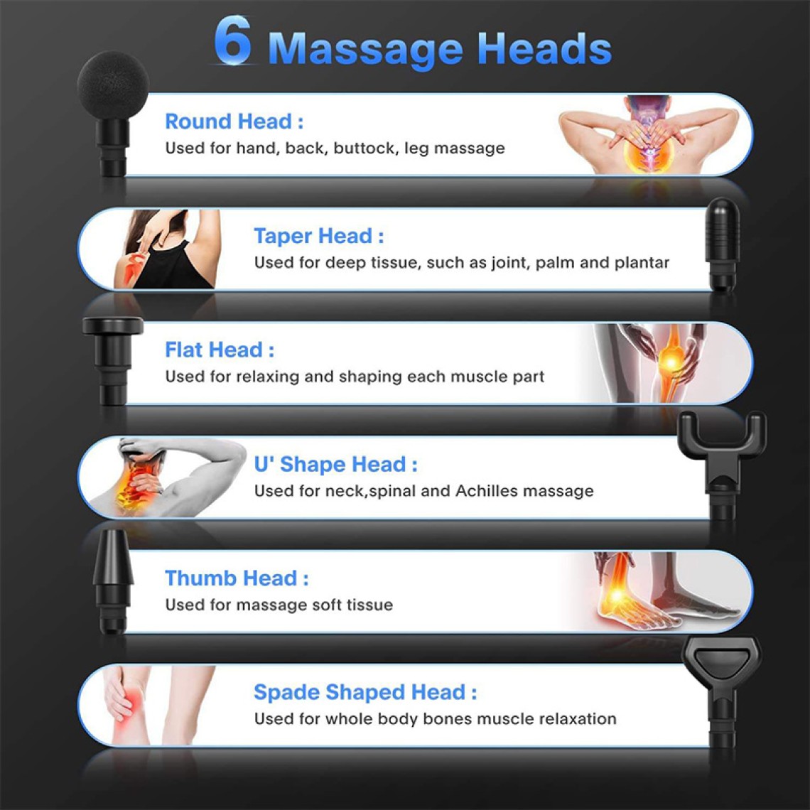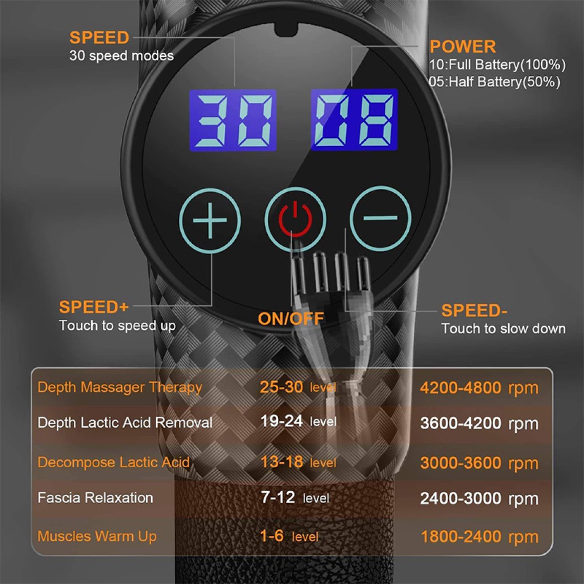 This massage gun features a high-performance brushless motor delivering powerful vibrations at 1200-3200 RPM, penetrating deep into muscle tissue to effectively relieve tension and soreness in the shoulders, neck, back, and entire body. With 30 adjustable speed settings, you can customize massage intensity for different body areas and needs, achieving precise deep relaxation. Built-in 1500mAh high-capacity battery delivers 4-6 hours of runtime, meeting household, sports, and fitness needs. Includes 6 specialized massage heads for targeted therapy on shoulder, neck, back, waist, and limb muscle groups. Features sequential control for safe operation and a comfortable, natural massage rhythm.Relief AreasIdeal for shoulders, neck, back, waist, arms, thighs, calves, and major muscle groups throughout the body. Effectively alleviates muscle soreness, stiffness, and fatigue while promoting blood circulation to accelerate recovery and deliver deep relaxation.