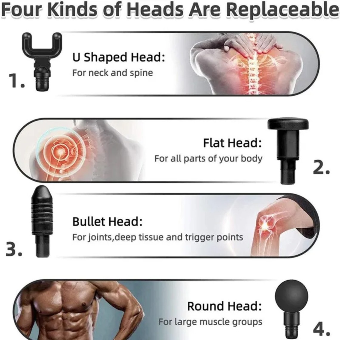 This massage gun features a high-performance brushed motor and a durable ABS plastic housing, delivering powerful vibrations ranging from 1100 to 3300 RPM. It effectively targets deep muscle tissue to relieve muscle tension and soreness. Designed for portability and ease of use, it features a button control panel for effortless adjustment of speed and operating modes. Powered by a built-in 1500mAh rechargeable battery with a rated power of 25W and voltage of 7.4V, it delivers ample runtime for home, gym, and daily use. Supports sequential control for rhythmic deep massage, aiding muscle relaxation and recovery.Relief AreasSuitable for shoulders, neck, back, waist, arms, thighs, calves, and full-body muscle groups. Effectively alleviates muscle soreness, stiffness, and fatigue while promoting blood circulation to accelerate recovery and deliver comforting relaxation.