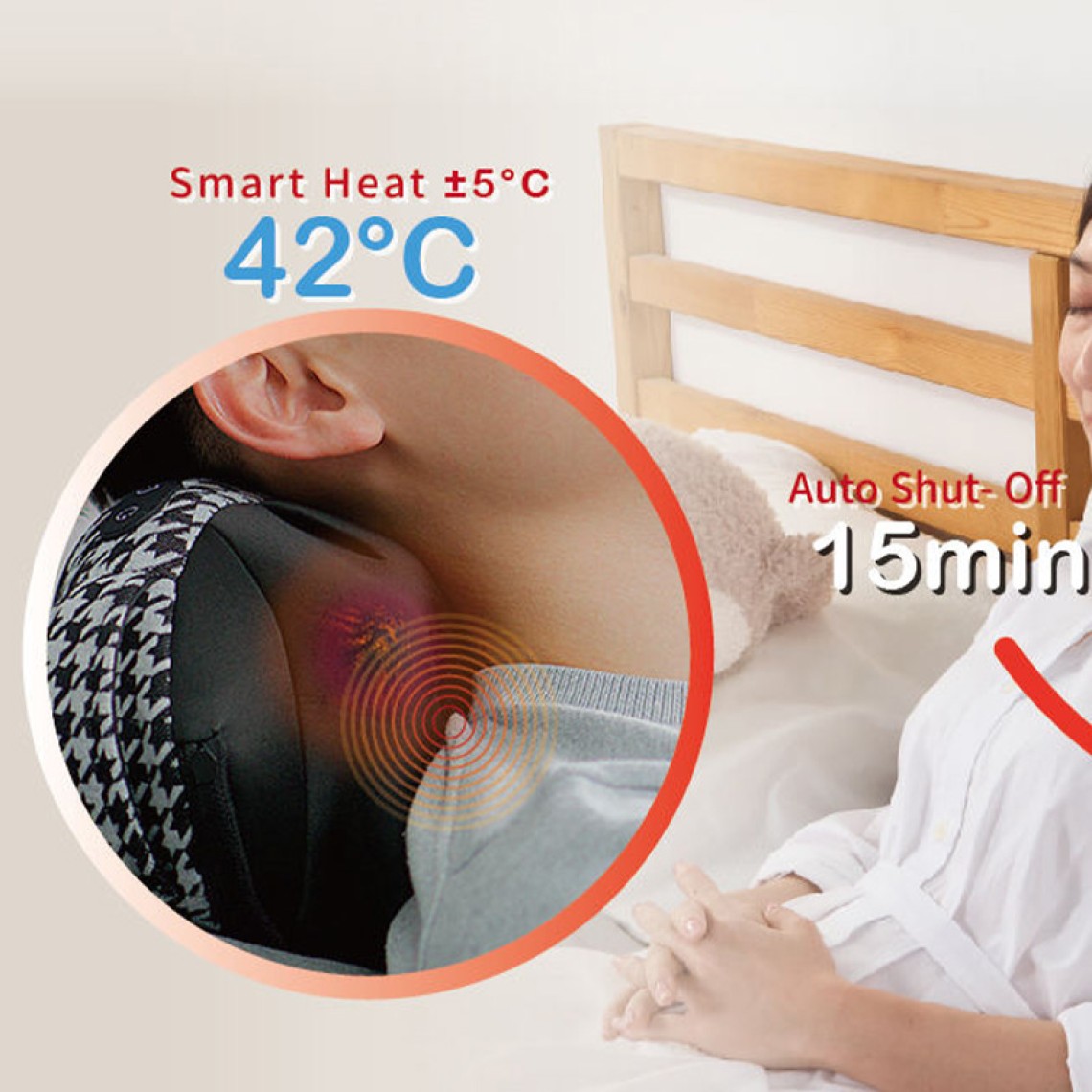 This massage pillow features a high-impact polystyrene support structure, ensuring even and comfortable massage pressure. It comes with a built-in 2000mAh battery for wireless use, operates at 12.8V/2A input voltage, and charges in approximately 3 hours. The sequence control function allows you to customize massage order and modes for a personalized relaxation experience. Weighing 2.5kg, it is sturdy and durable, suitable for home, office, or travel use.Relief AreasCervical Spine (Relieves neck stiffness and soreness)Shoulders (Eases shoulder tension and stress)Upper Back & Waist (Deeply relaxes muscles surrounding the spine)Legs (Alleviates fatigue and soreness from prolonged sitting or exercise)Shoulder-Neck Junction (Reduces discomfort from chronic pressure points)