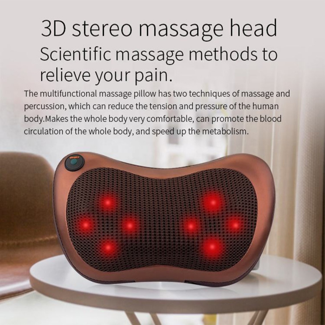 This massage pillow features premium PU material and breathable mesh fabric, with 4 to 8 adjustable massage heads combined with infrared therapy to deliver deep kneading and soothing massage for the neck, shoulders, back, and waist. Whether at home, in the office, or in the car, it effectively relieves muscle tension and soreness while promoting blood circulation and whole-body relaxation. Product dimensions: 320 x 98 x 200 mm. Lightweight and portable, it’s easy to store and carry, meeting massage needs in various settings.Relief AreasNeck (Relieves cervical tension and stiffness)Back (Soothes back muscle soreness)Lower Back (Alleviates lumbar pressure and fatigue)