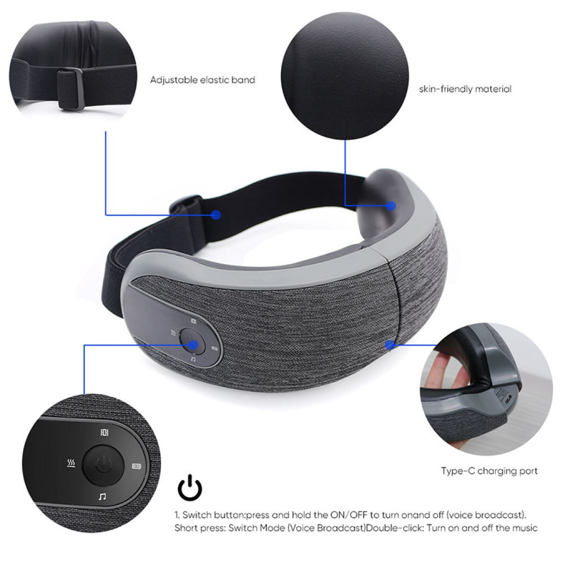 This eye massager combines air pressure, vibration, heat therapy, music, and voice prompts into one device. With Bluetooth connectivity, it makes eye care smarter and more convenient. Featuring a built-in 1200mAh battery charged via Type-C port, it delivers extended use on a single charge. Crafted from ABS and suede materials, it offers comfortable wear that contours to facial features. Multiple massage modes effectively relieve eye fatigue, tension, and soreness, while music and voice guidance enhance relaxation—ideal for extended screen users and bedtime routines.Relief AreasEyes and Periorbital Area: Alleviates fatigue, soreness, and drynessBrow Bones and Temples: Reduces head tension and pressureUpper/Lower Eyelids and Eye Corners: Eases dark circles and puffinessPeriorbital Muscles: Relaxes eye muscles, relieving visual strain